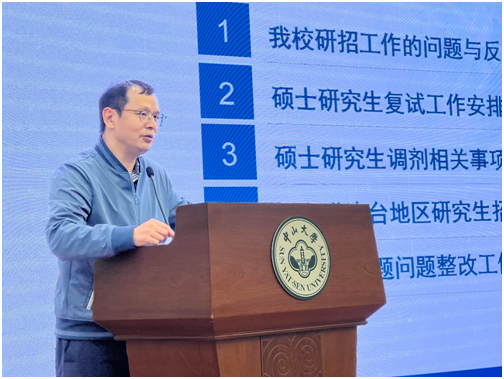隨后,研究生院陳曾平院長(zhǎng)就如何落實(shí)具體工作進(jìn)行了詳細(xì)布置。他總結(jié)梳理了碩士研究生招生工作過程可能出現(xiàn)的問題及存在的風(fēng)險(xiǎn)點(diǎn),結(jié)合教育部和廣東省教育考試院2024年全國(guó)碩士研究生招生復(fù)試錄取工作會(huì)議精神,細(xì)致介紹學(xué)校碩士研究生招生復(fù)試錄取工作安排,對(duì)復(fù)試工作通知、復(fù)試方式、復(fù)試方案、復(fù)試組織、復(fù)試流程、復(fù)試紀(jì)律等提出了具體要求。他指出,要以研究生培養(yǎng)方案修訂為契機(jī),加強(qiáng)頂層設(shè)計(jì),推動(dòng)分類發(fā)展。他還詳細(xì)介紹了培養(yǎng)方案修訂的有關(guān)要求,以及研究生課程運(yùn)行管理、導(dǎo)師任職資格認(rèn)定、學(xué)位授權(quán)自主審核及學(xué)位點(diǎn)周期性合格評(píng)估、論文答辯與學(xué)位授予審核等工作的新思路、新舉措,為下一步開展工作提供了新指引。