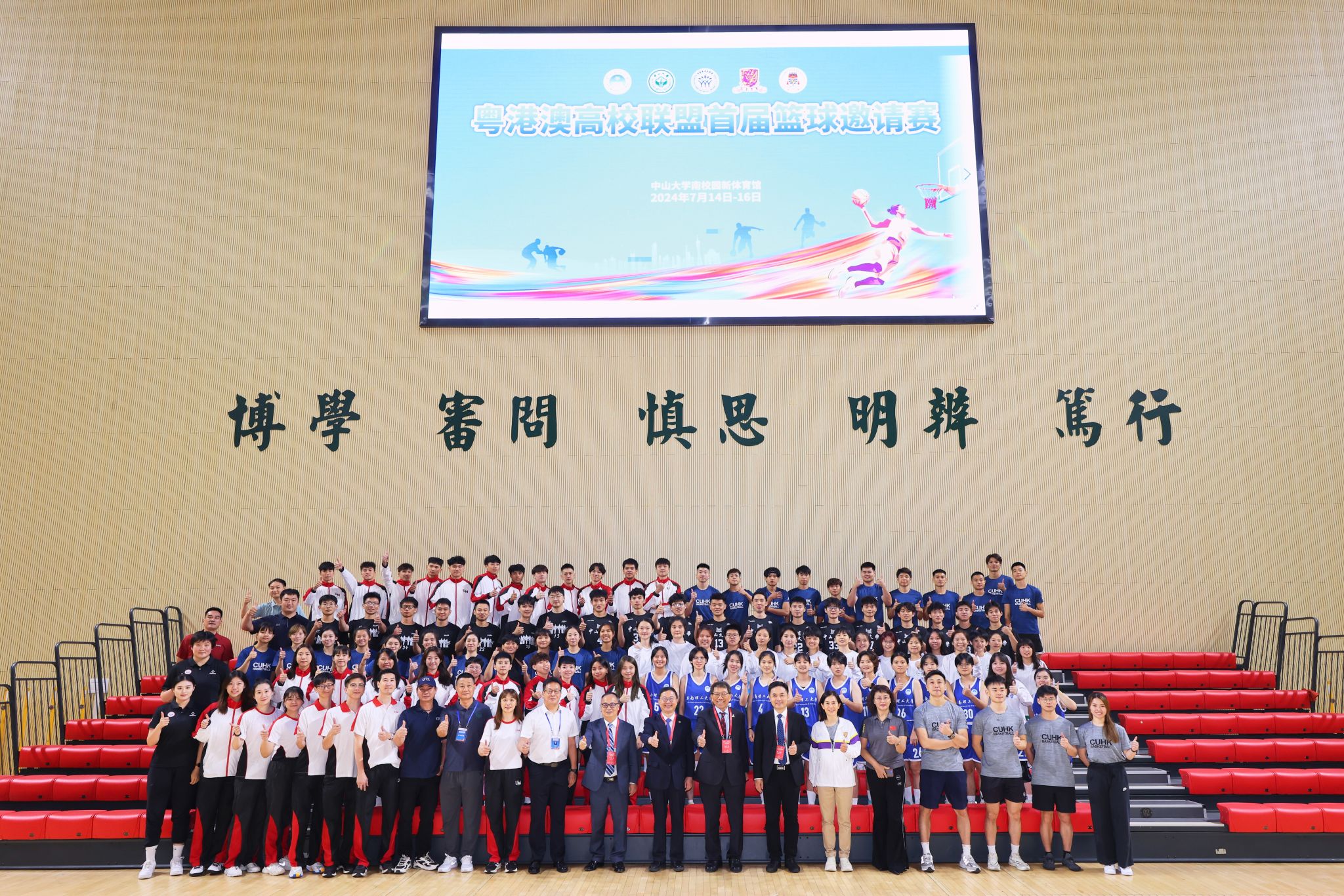 粵港澳高校聯盟首屆籃球邀請賽上,四所創盟高校領導與參賽隊員合影