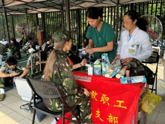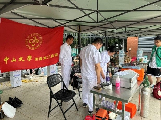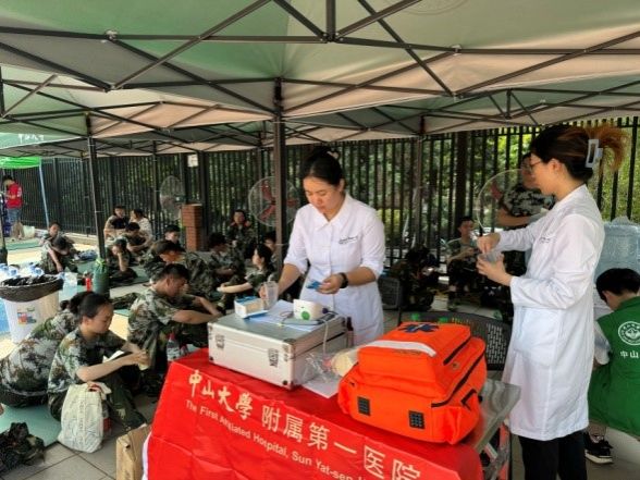 在西大球場的烈日下,中山大學附屬第一醫院、孫逸仙紀念醫院、附屬第三醫院及附屬第六醫院的醫療團隊輪流值守,時刻準備為軍訓中感到不適的學生提供及時的醫療服務。而在另一側的英東田徑場,南校園門診部則以其一貫的堅守與奉獻,持續為軍訓新生提供全天候的醫療保障服務。現場均配備了專業的急救設備和充足的藥品,確保能夠在第一時間對突發狀況進行有效處理,減輕學生的痛苦,穩定病情。