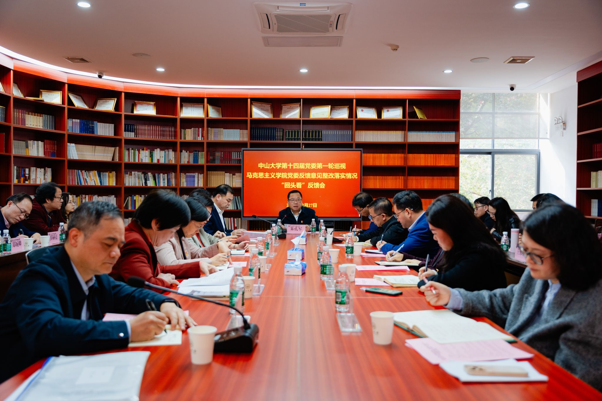 “回頭看”第一巡視組組長羅干坤宣讀了《中山大學第十四屆黨委第一輪巡視馬克思主義學院黨委反饋意見整改落實情況“回頭看“的反饋意見》。馬克思主義學院黨委書記陳有志作表態發言。學校黨委副書記、聯系馬克思主義學院校領導王帆,學校黨委常委、組織部部長楊曉萌,紀委副書記吳長征,黨委巡視工作辦公室主任謝曼華,馬克思主義學院黨政領導班子成員,黨支部書記,教研室主任,教職工、學生代表等40余人參加會議。