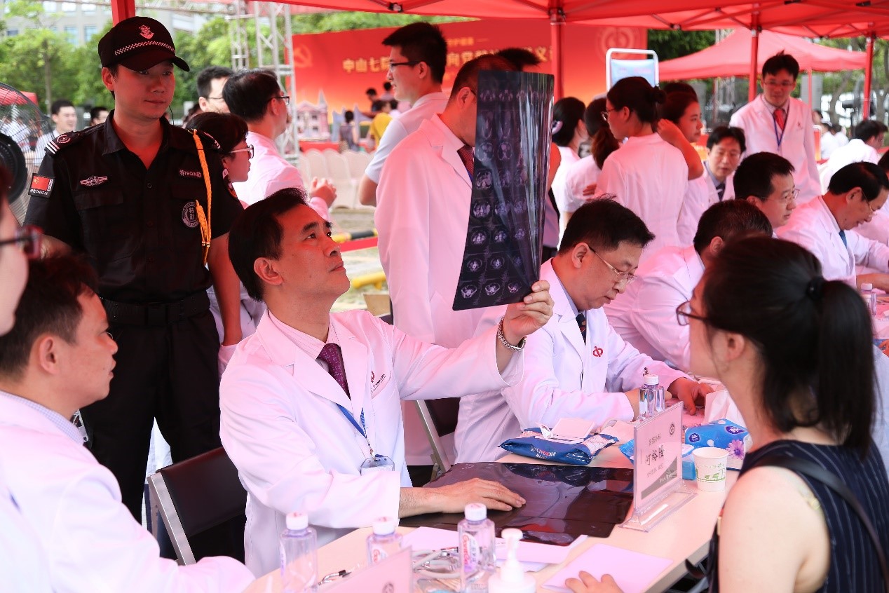 何裕隆教授(中間)在義診現(xiàn)場(chǎng)(來(lái)源:附屬第七醫(yī)院)
