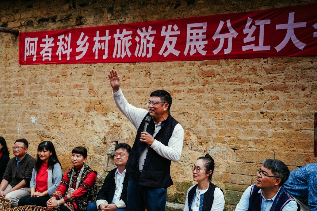 保繼剛教授(中間)在阿者科鄉(xiāng)村旅游發(fā)展第五次分紅大會(huì)上(來(lái)源:旅游學(xué)院)