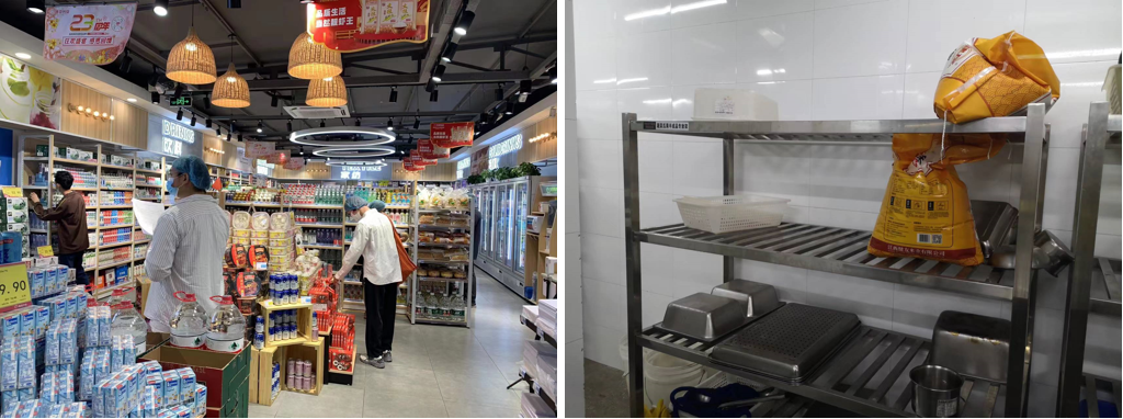 左:檢查商鋪食品安全;右:層架物品擺放不規范情況(來源:總務部)