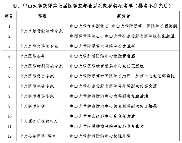 中山大學常務副校長、中山大學附屬第一醫(yī)院院長肖海鵬,中國科學院院士、中山大學孫逸仙紀念醫(yī)院院長宋爾衛(wèi)獲得“十大卓越貢獻院管專家”榮譽;中山大學附屬第六醫(yī)院院長文衛(wèi)平獲得“十大思想力院管專家”榮譽;中山大學腫瘤防治中心管忠震教授獲得“十大醫(yī)學泰斗”榮譽;中山大學醫(yī)學教育發(fā)展中心主任王庭槐獲得“十大醫(yī)學特別貢獻專家”;中山大學附屬第六醫(yī)院院長助理、腫瘤中心主任鄧艷紅獲得“十大醫(yī)學促進專家”榮譽;中山大學孫逸仙紀念醫(yī)院普外科副主任李文濱獲得“十大醫(yī)學先鋒專家”榮譽;中山大學腫瘤防治中心內(nèi)科副主任蔡清清獲得十大醫(yī)學菁英專家榮譽;中山大學腫瘤防治中心結(jié)直腸科副主任丁培榮獲得“十大醫(yī)學新銳”榮譽;中山大學中山眼科中心副主任袁進、中山大學附屬腫瘤醫(yī)院腫瘤科主任張力獲得“十大原創(chuàng)研究領銜者”榮譽;中山大學腫瘤防治中心胰膽外科獲得“十大公益醫(yī)院/科室”榮譽。