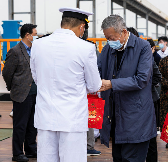 陳春聲書記登船后,代表學校黨委和高松校長親切慰問了船員,詢問大家的工作和生活情況,對他們春節期間堅守崗位表示敬意,并為船員們送上節日禮品和祝福。