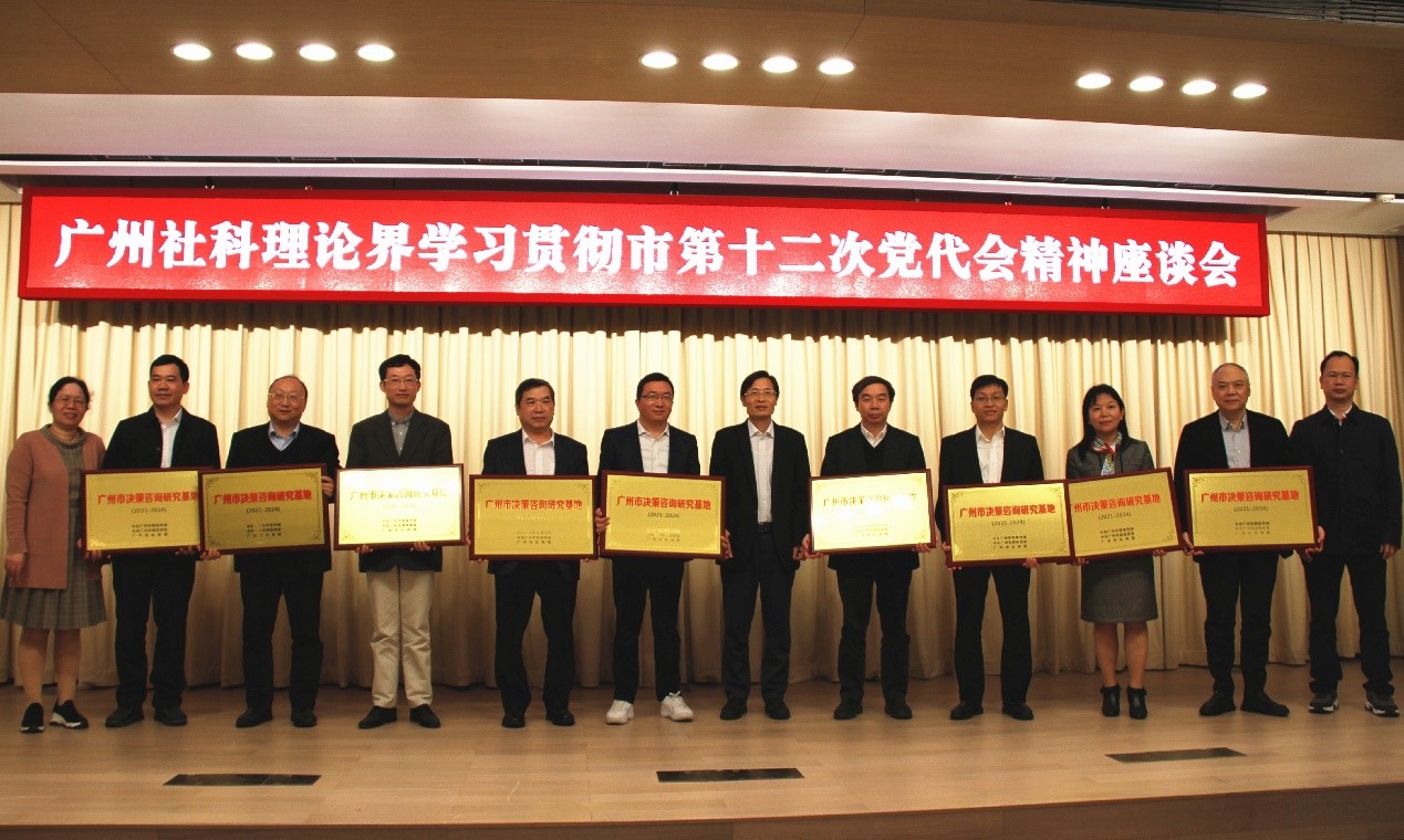 中大新聞網1月20日廣州電(通訊員李嘉暉)近日,廣州社科理論界學習貫徹廣州市第十二次黨代會精神座談會舉行。廣州市委常委、宣傳部部長杜新山為中山大學城市治理創新研究基地等首批九家決策咨詢研究基地授牌,廣州市委宣傳部常務副部長、市社科聯黨組書記、主席曾偉玉介紹了決策咨詢研究基地建設和總體部署。廣州市委政研室主任鄧建富、中山大學傳播與設計學院張志安教授、盧家銀教授等專家學者和媒體代表出席了會議。