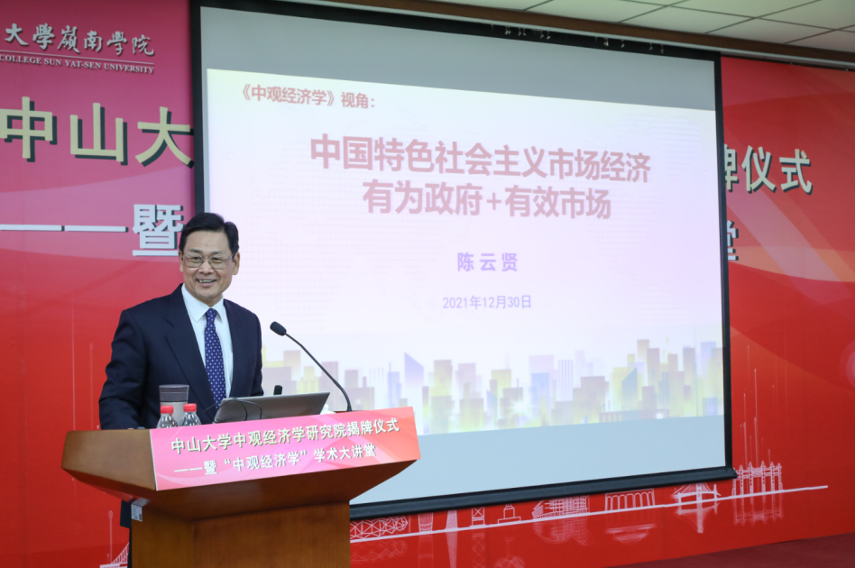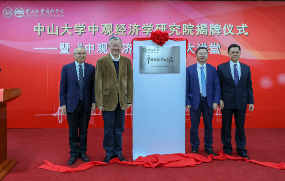 中山大學黨委書記陳春聲教授、中山大學校長高松院士、陳云賢教授、副校長兼嶺南學院院長李善民教授共同為中觀經濟學研究院揭牌。