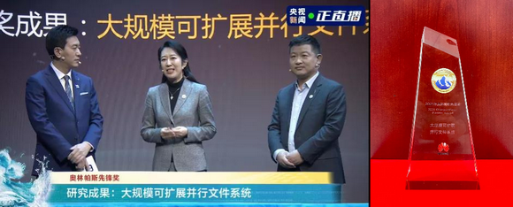 以太陽系最高峰命名的“奧林帕斯獎”(OlympusMons Awards)由華為公司于2019年設立,寓意科研工作者勇攀高峰,共同解決存儲領域的挑戰性難題,點亮數字文明。中山大學國家超算廣州中心主任盧宇彤教授團隊從架構到系統自主創新設計和實現的“大規模可擴展并行文件系統”,應對“構建每bit極致性價比的數據存儲”難題,獲得本年度“奧林帕斯先鋒獎”。頒獎典禮通過央視新聞在線直播。