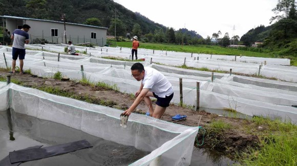 結合柯木灣村交通便利,運輸成本低,水源清潔充足的特點,在校友企業荊州市民康生物科技有限公司技術支持下,學校在柯木灣村開展15畝水蛭養殖試點項目,組織貧困戶成立專業合作社,通過村集體帶動貧困戶增收。水蛭養殖是新生事物,從工作隊到村民,沒人有相關經驗,這就需要具體工作人員投入大量的時間精力,隨時觀察水蛭生長情況,隨時處理問題,同時還要承擔難以預測的風險。經過反復論證、思考,李曉超給自己制定了工作方針:敢闖敢干,精益求精。他積極向校友企業派出的技術員請教,學習水蛭養殖基本知識,向學校隨時反饋養殖進展和問題。同時與村支部溝通協商,組成一線工作小組,讓村委會的黨員干部擔任項目負責人,選派貧困戶中的黨員代表擔任養殖員,高效解決實際問題,帶動村黨員在攻堅克難中發揮先鋒模范作用。水蛭養殖的飼料來源是水螺,按照最初計劃,由校友企業大批量從湖北運送,成本低。但很快發現,因長途運輸問題,水螺死亡率高,且儲存后再投喂,養殖員工作量加大。如果改從本地采購,因本地水螺以食用為主,成本比較高,很難盈利。這個問題不解決,項目面臨失敗的風險。李曉超和村委會干部四處奔走,在連州周邊地區尋求供貨源。經過努力,最終找到了穩定的供貨渠道,少量多次進貨,直接投喂,解決了燃眉之急。