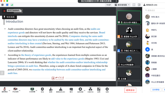 章紅波教授就內審經理變更的重要性進行探討,并分享了如何用中國的數據做一篇高質量研究的經驗。章教授還通過展示中山大學深圳校區的規劃圖表達了對商學院發展的美好祝福。