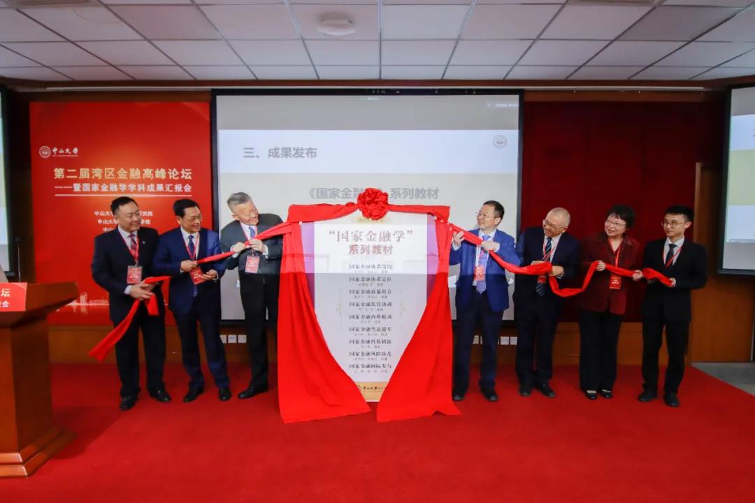 中山大學高級金融研究院名譽院長陳云賢教授、中山大學黨委書記陳春聲教授、校長高松院士、副校長李善民教授、中山大學出版社社長王天琪、作者代表周天蕓教授、作者代表張一林副教授共同發布教材。