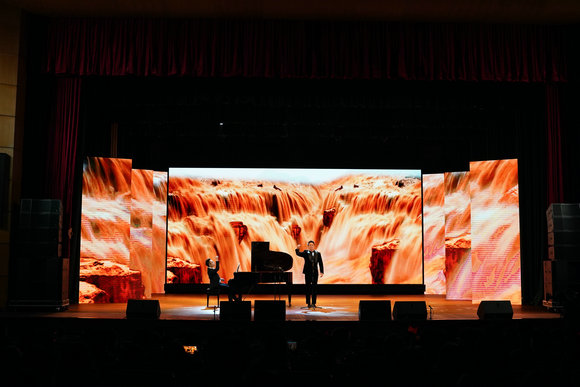 “驚濤澎湃,掀起萬丈狂瀾”。男中音獨唱《黃河頌》,唱出了萬里黃河的壯闊豪邁,頌出了華夏兒女奮力圖強的民族之魂。