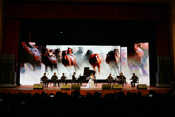 二胡合奏曲《戰馬奔騰》再現氣勢磅礴的戰爭場面。“鐵蹄奮起百鈞輕,長刀驅虜若奔雷”,邊防戰士一往無前,保家衛國的錚錚誓言響徹耳畔。