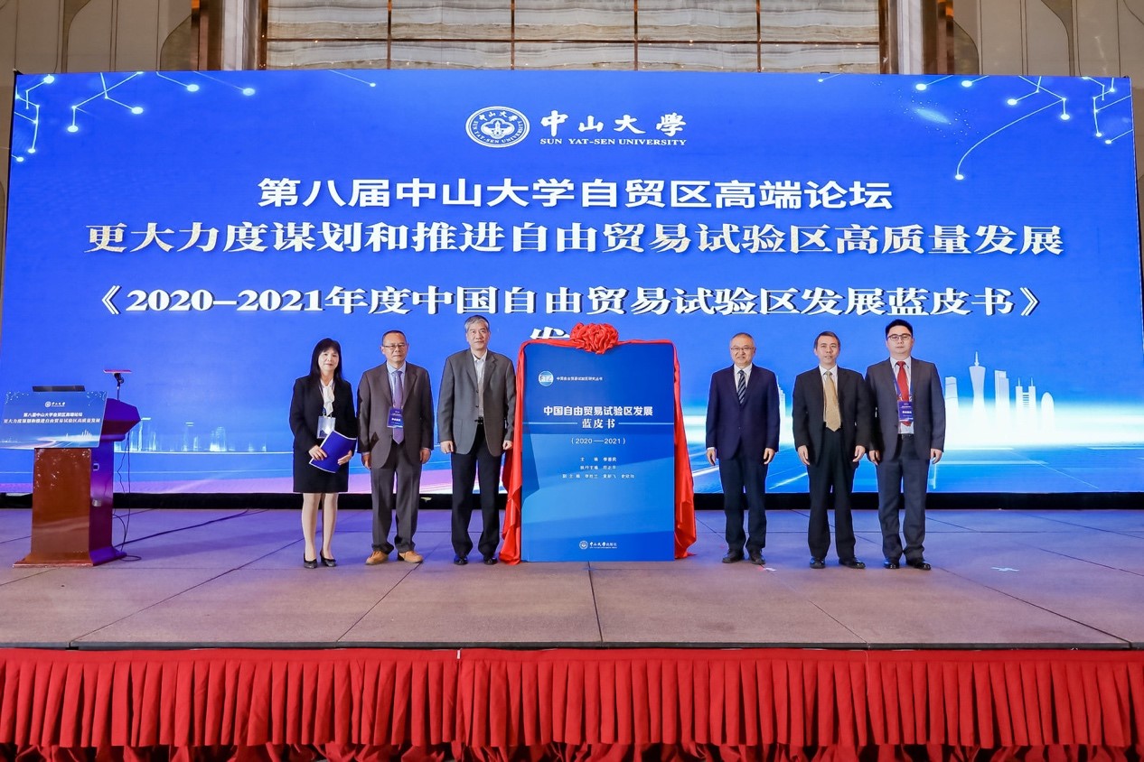 接著,中山大學副校長、自貿區綜合研究院理事長李善民教授,中山大學自貿區綜合研究院院長符正平教授,中山大學出版社總編輯徐勁和中山大學自貿區綜合研究院副院長李勝蘭教授、黃新飛教授、史欣向副教授共同揭牌,正式發布“2020-2021年度中國自由貿易試驗區發展藍皮書”。該藍皮書已連續六年發布,全方位、多角度地對我國自貿試驗區的發展進行深入解讀,累計銷量超萬冊。本年度的藍皮書分為專題編、區域編,并首次加入了中國自由貿易試驗區制度創新指數報告。