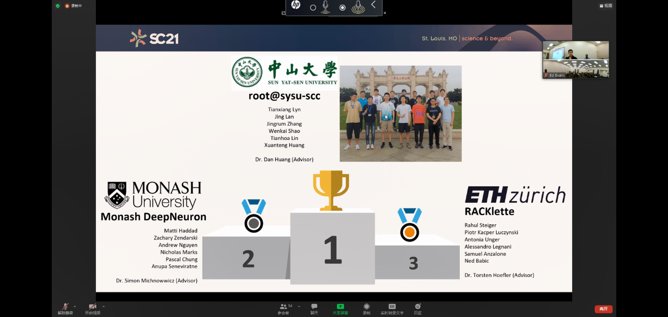 中山大學超算隊依托計算機學院的師資力量、國家超級計算廣州中心的資源支持,近年來一直活躍在國內外重大超算賽事中,已經成為國內外超算領域賽事中一支極具競爭力的隊伍,向世界展現中大學子的能力和風采。超算隊在今年三大國際超算賽事中均斬獲佳績,除本次獲獎,已經在ASC20-21世界大學生超算競賽中奪得季軍, 并打破Linpack記錄,獲得最高性能獎;在ISC21國際大學生超算競賽中收獲第四名以及Honorable Mention榮譽稱號。此外,超算隊也一直活躍在國內高性能計算相關競賽中,僅在今年已3次登上領獎臺:在第二屆中科院先導杯計算應用大獎賽(PRA21)中獲得CP2K應用賽道第三名;在第五屆國產CPU并行應用挑戰賽(CPC)中獲得第三名;在第二屆ACM中國-國際并行應用挑戰賽(IPCC)中獲得第三名。