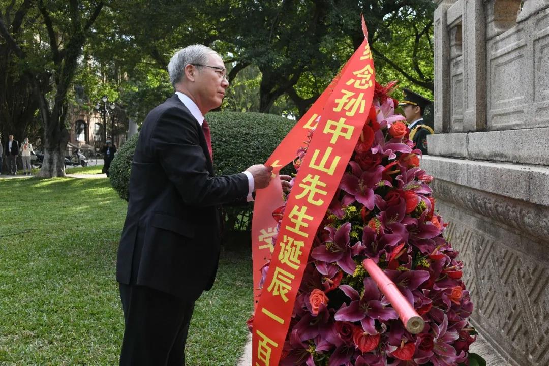 中大新聞網(wǎng)11月13日廣州電(記者孫琛)11月12日上午,為紀(jì)念中國(guó)民主革命的偉大先驅(qū)孫中山先生誕辰155周年、孫中山先生親手創(chuàng)辦中山大學(xué)97周年,我校舉行校慶日向?qū)O中山先生銅像獻(xiàn)花暨升旗儀式。學(xué)校黨政領(lǐng)導(dǎo),各職能部門(mén)、院系及附屬單位負(fù)責(zé)人和師生代表在完成核酸檢測(cè)后參加儀式。