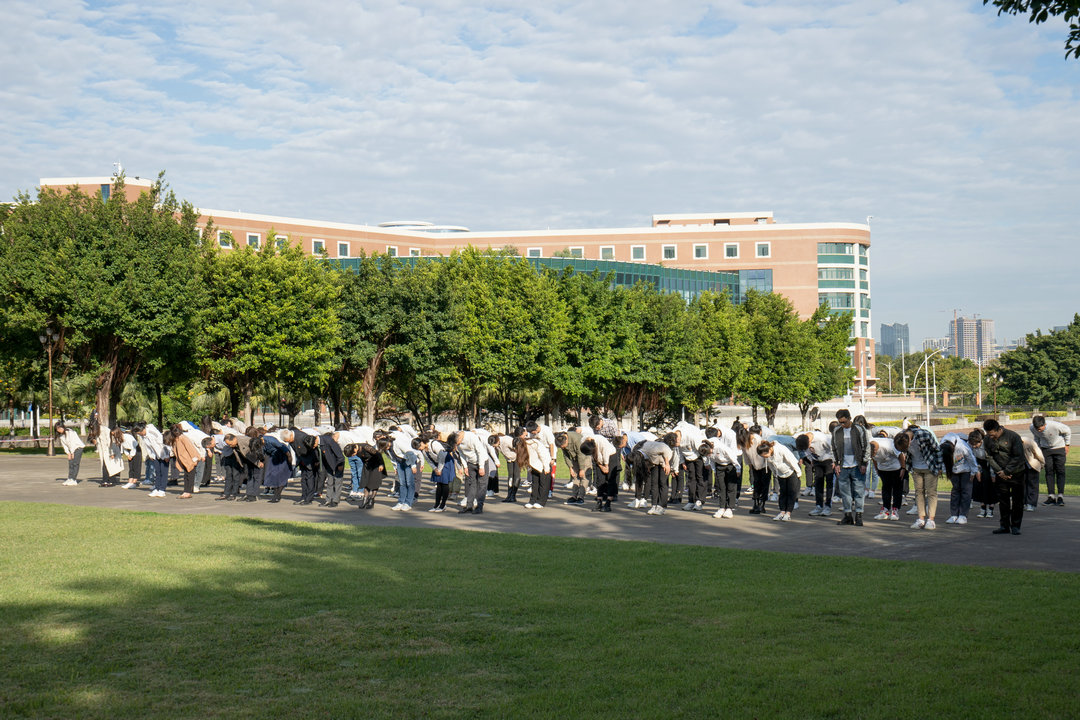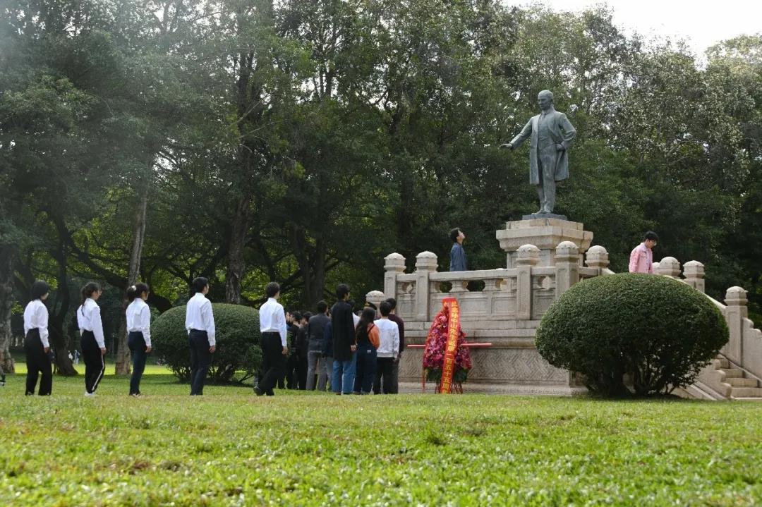 廣州校區(qū)東校園觀禮師生向先生銅像行鞠躬禮(來(lái)源:黨委宣傳部 溫林楓攝)