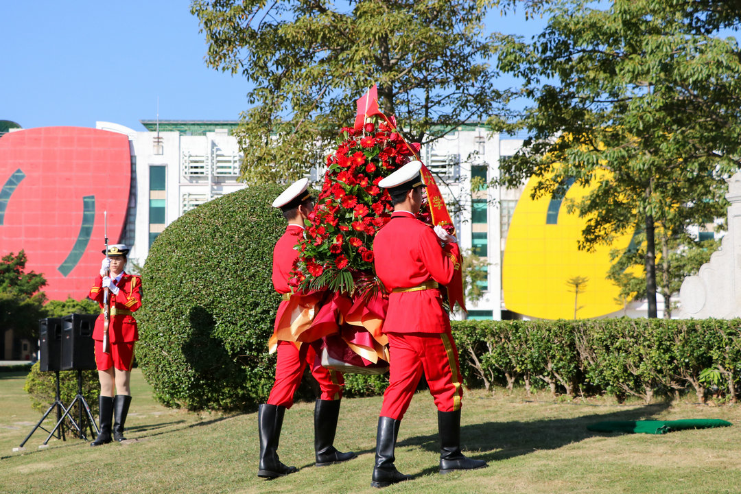 升旗儀式后,敬獻(xiàn)花籃曲響起,國(guó)旗班代表將花籃穩(wěn)步抬至孫中山先生銅像基座前。主禮校領(lǐng)導(dǎo)緩步上前,仔細(xì)整理花籃緞帶。紅色緞帶上印著“紀(jì)念孫中山先生誕辰一百五十五周年”,寄托了全體中大人對(duì)中山先生的深切緬懷和崇高敬意。