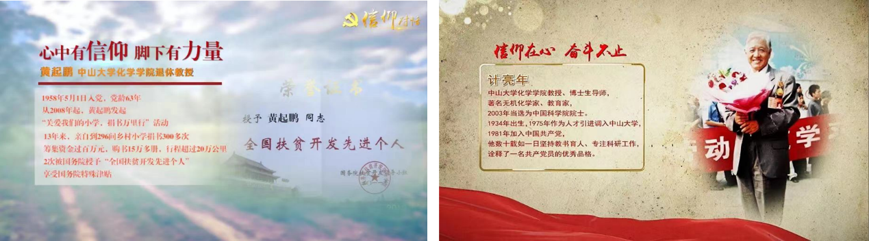 學院黨委舉辦黨支部建設專題培訓班,面向全體黨支部委員集中開展黨史專題學習及黨務知識培訓;組織黨員參觀農講所、中共三大會址、廣州起義烈士陵園等,通過實地參觀、沉浸式教學,緬懷革命先烈,感悟黨的初心;開展“信仰對話”活動,尋訪拍攝黃起鵬、計亮年、陳小明三位老黨員,讓學生黨員從老一輩黨員講述初心使命和詮釋愛黨真情中學黨史、悟思想;制作《捐書萬里行——黃起鵬教授捐書畫冊》,出版《從學徒工到中國科學院院士——計亮年傳》,傳承紅色基因;組織觀看《長津湖》《懸崖之上》等優秀黨史主題影視作品;21個黨支部100%召開黨史學習教育專題組織生活會,學院黨委全體委員除作為普通黨員參加本支部組織生活會外,均列席除本支部外的黨支部的專題組織生活會。