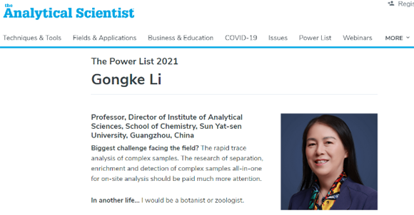 中大新聞網訊(通訊員肖小華)近日,中山大學化學學院李攻科教授入選2021年“世界最具影響力100位分析科學家”榜單。該榜單由英國The Analytical Scientist雜志根據世界范圍內分析屆的獨立提名和層層遴選確定。中山大學李攻科教授等4位來自中國的分析科學家上榜。