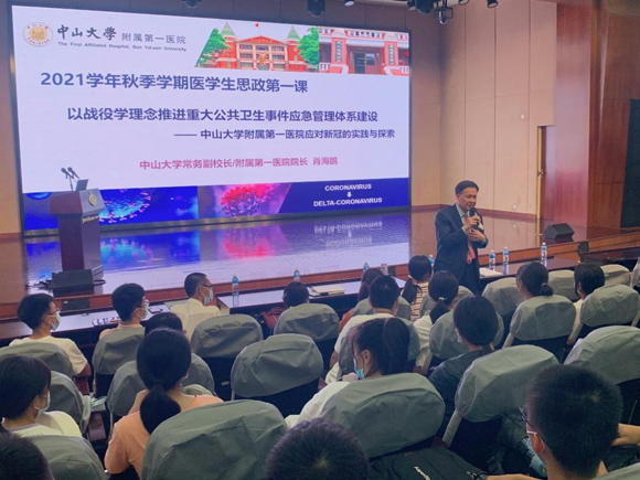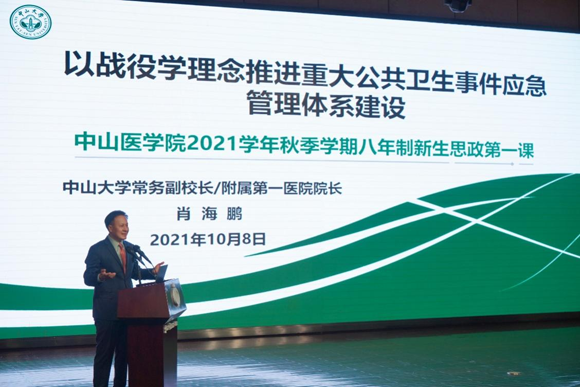10月8日晚,首批全國高校黃大年式教師團隊負責(zé)人、中山大學(xué)常務(wù)副校長、附屬第一醫(yī)院院長肖海鵬教授以“‘戰(zhàn)役學(xué)’理念推進重大公共衛(wèi)生事件應(yīng)急管理體系建設(shè)的實踐與探索”為主題,講述黨史、新中國史、醫(yī)科發(fā)展史和校史、院史,為醫(yī)學(xué)新生開講思政第一課。