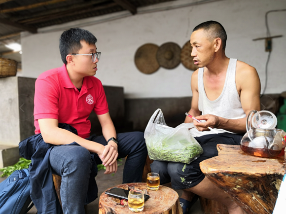 藍(lán)澍德(左)走訪紅木村自然村茶葉初制所(來源:校工會)