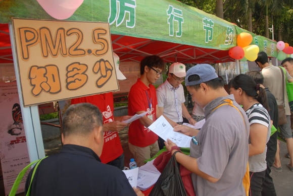 在石巖影劇院廣場,環(huán)境科學(xué)與工程學(xué)院學(xué)生與寶安區(qū)環(huán)境保護(hù)和水務(wù)局工作人員、石巖街道義工共同開展了關(guān)于PM2.5及低碳生活的環(huán)保知識(shí)宣傳。現(xiàn)場設(shè)有PM2.5知識(shí)普及區(qū)、環(huán)保工藝設(shè)計(jì)展示、低碳生活知識(shí)咨詢區(qū)等。學(xué)生們向居民派發(fā)了PM2.5環(huán)保小寶典、低碳生活知識(shí)小冊(cè)子及《寶安區(qū)環(huán)境保護(hù)和水務(wù)局便民服務(wù)指引》等宣傳資料以及環(huán)保袋、小錦囊等小禮物。社區(qū)居民紛紛被攤位吸引,前來觀看設(shè)計(jì)展并向工作人員咨詢環(huán)保建議。