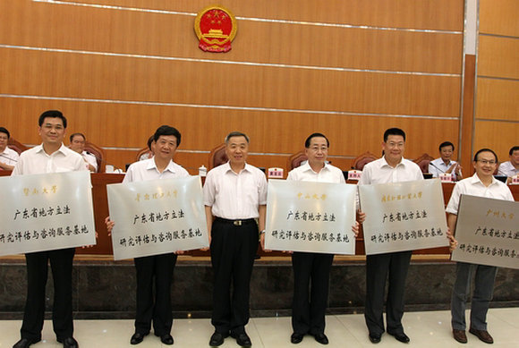 授匾儀式結束后,省人大常委會召開了“廣東省地方立法研究評估與咨詢服務基地”成立儀式座談會。黃龍云主任就基地成立的指導思想、基本任務、工作重點等方面做出進一步闡述,對發揮高校在地方立法工作的作用,豐富立法渠道,提升立法質量提出懇切的要求。他冀望各高校多出高水平的立法成果,為廣東推進依法治省建設,為實現“三個定位,兩個率先”做出貢獻。讓我們的工作經得起歷史的檢驗、實踐的檢驗、群眾的檢驗。