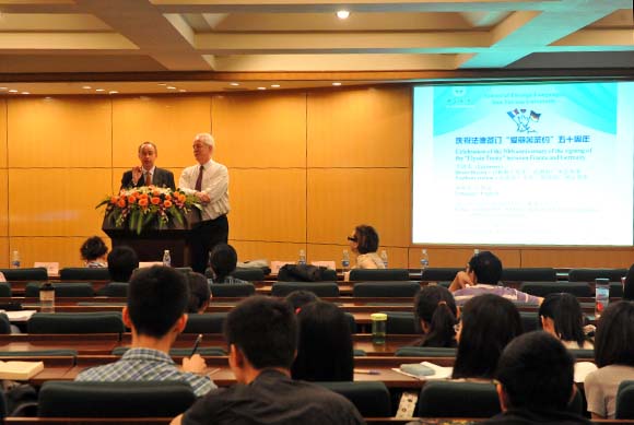 藉法德簽訂《愛麗舍條約》五十周年之際,5月14日上午,法國駐廣州總領事Bruno Bisson(白嶼淞)及德國駐廣州總領事Stephane Gallon(高思范)先生蒞臨我校,在外國語學院舉行聯合講座。外國語學院院長常晨光、國際合作與交流處副處長徐瑤、德語系系主任王蓓蓓教授、法語系系主任曾曉陽副教授以及來自我校的師生100余人參加了本次活動。