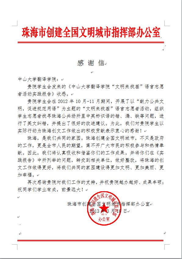 近日,珠海市創建全國文明城市指揮部辦公室向我校翻譯學院發來感謝信,對翻譯學院學生會開展的“文明來找茬”語言志愿服務活動給予高度評價,對學生撰寫提交《珠海市公共場所中英文標識翻譯規范報告》、為珠海創建全國文明城市建言獻策的助力行動,表達了誠摯的感謝。