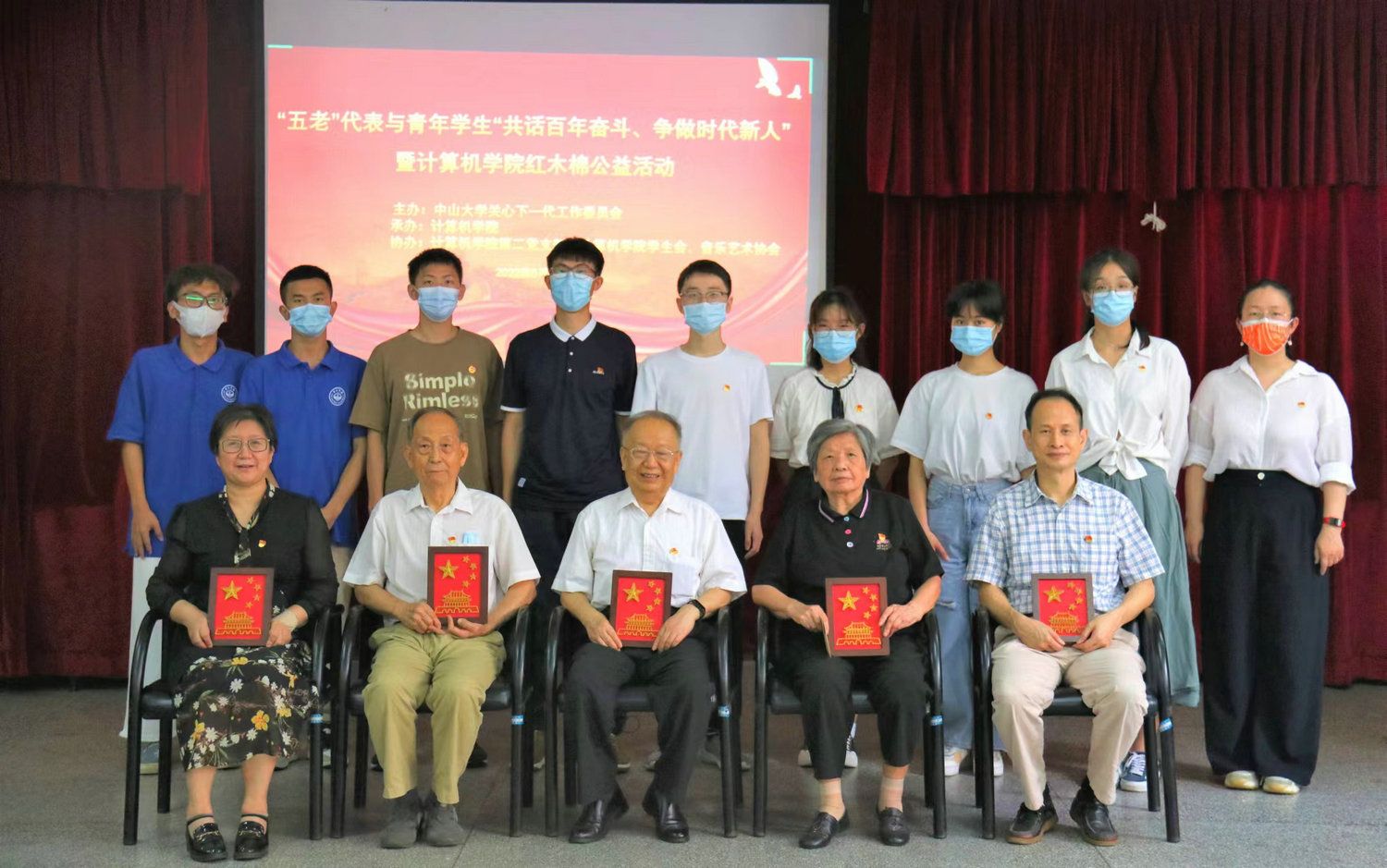中大新聞網廣州6月11電(通訊員晏敏貞)近日,由中山大學關工委主辦,離退休工作處、計算機學院協辦的“五老”代表與青年學生“共話百年奮斗,爭做時代新人”黨史學習教育暨紅木棉公益活動在廣州校區南校園老年人活動中心順利舉行?!拔謇稀贝?、學生黨員、入黨積極分子、主協辦單位負責人、計算機學院學生會、音樂藝術協會代表等近60人以線上線下相結合的方式參加活動。