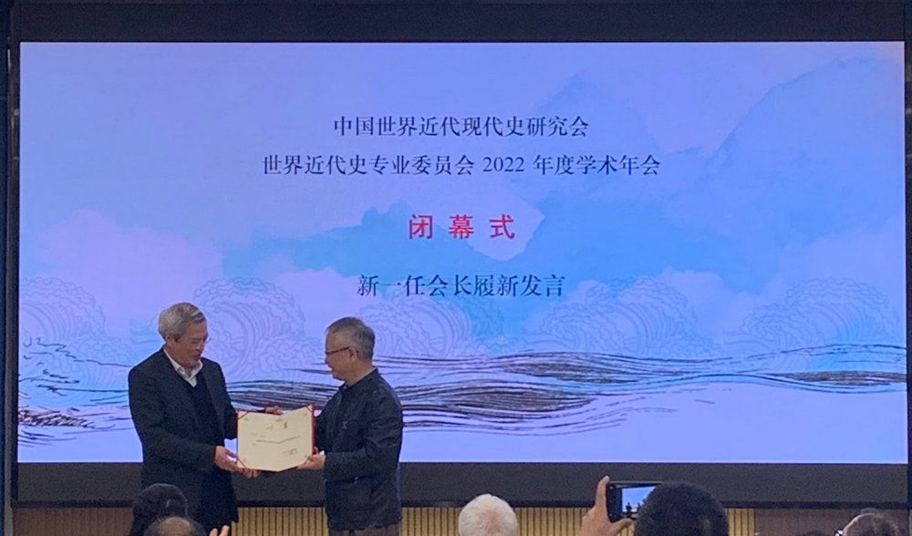 閉幕式由學(xué)會(huì)新當(dāng)選的秘書長(zhǎng)張煒副研究員主持。新當(dāng)選的學(xué)會(huì)領(lǐng)導(dǎo)與會(huì)員見面,俞金堯會(huì)長(zhǎng)為新一屆副會(huì)長(zhǎng)和秘書長(zhǎng)頒發(fā)履職證書,并為高毅教授頒發(fā)了名譽(yù)會(huì)長(zhǎng)證書。高毅教授對(duì)學(xué)會(huì)新一屆領(lǐng)導(dǎo)班子表示祝賀。隨后,俞金堯會(huì)長(zhǎng)進(jìn)行了履新發(fā)言。俞金堯會(huì)長(zhǎng)對(duì)上一任領(lǐng)導(dǎo)班子表示感謝,并對(duì)學(xué)會(huì)未來(lái)的工作進(jìn)行了展望和安排。他期望學(xué)會(huì)今后除了辦好年會(huì)之外,還可以召開專題研討會(huì)促進(jìn)學(xué)者交流,培養(yǎng)青年史學(xué)人才,共同推動(dòng)世界近代史研究的發(fā)展。最后,中山大學(xué)歷史學(xué)系副主任費(fèi)晟教授代表本屆承辦方對(duì)學(xué)會(huì)的信任和來(lái)自全國(guó)各地同仁的支持表示感謝。四川大學(xué)歷史文化學(xué)院世界史系主任呂和應(yīng)副教授作為下一屆年會(huì)的承辦方熱情邀約各位會(huì)員在今年冬季齊聚成都。中國(guó)世界近代現(xiàn)代史研究會(huì)世界近代史專業(yè)委員會(huì)2022年度學(xué)術(shù)年會(huì)圓滿閉幕。