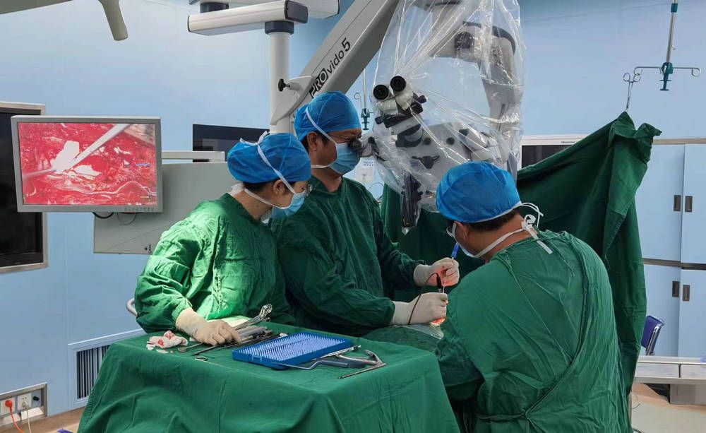 鳳慶縣人民醫院神經外科以往技術薄弱,缺乏開展顯微外科的設備和技術,神經腫瘤手術更是醫院技術空白。范翔知道,這次幫扶的主要任務之一就是對神經腫瘤手術進行系統教學、規范診療,幫助當地醫務人員掌握顯微技術。在幫扶過程中,范翔在儀器缺乏的情況下,通過借用顯微鏡,自帶顯微器械,還克服了沒有頭架和自動牽開器等種種困難,累計開展了5例神經腫瘤手術,并取得良好效果。在填補了醫院開展神經外科顯微手術空白史的同時,還鍛煉了科室隊伍、帶動科室醫生熟悉顯微操作,為后續醫療幫扶打下良好基礎。其中,左側海綿竇旁腦膜瘤顯微切除手術還被人民日報網絡版報道,提高了鳳慶縣人民醫院的知名度和影響力。在范翔幫扶結束時,醫院購買的顯微鏡和相關器械均已到位,他深信,這些都將對神經外科的發展起到積極作用。