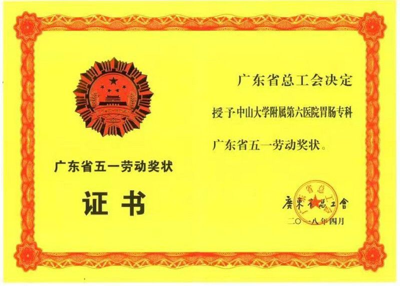 2018年,附屬第六醫院胃腸??偏@廣東省五一勞動獎狀
