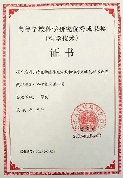 蘭平教授團隊《結直腸癌篩查方案和治療策略的技術創新》項目榮獲教育部科研優秀成果獎科技進步獎一等獎