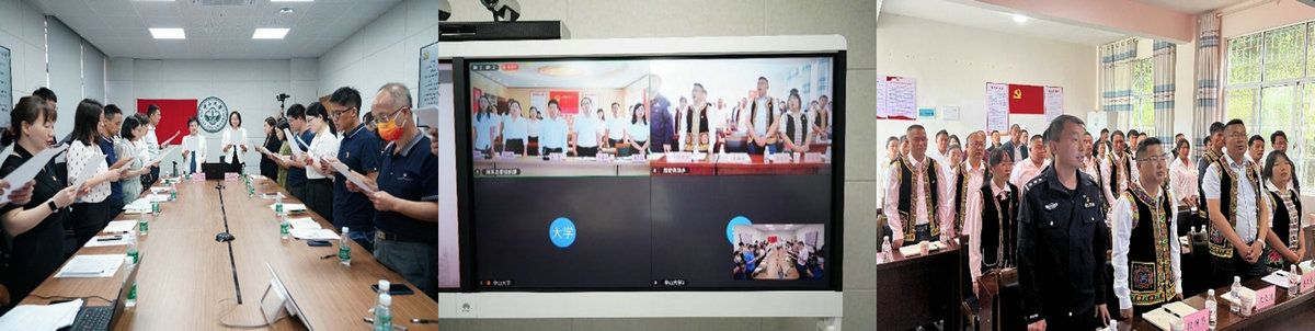 中大新聞網(wǎng)廣州5月22日電(通訊員劉潔予、曹海林)夏樹蒼翠,風(fēng)清氣和。為深入開展學(xué)習(xí)貫徹習(xí)近平新時代中國特色社會主義思想主題教育,加強(qiáng)校地基層黨組織結(jié)對共建,5月19日上午,學(xué)校黨委組織部黨總支第一黨支部、馬克思主義學(xué)院黨委中國近現(xiàn)代史綱要教研室專任教師黨支部和云南鳳慶縣委組織部黨支部以線下線上結(jié)合方式“齊聚一堂”,以“學(xué)思想強(qiáng)黨性重實(shí)踐建新功,三支部聯(lián)學(xué)聯(lián)建,譜寫協(xié)同發(fā)展新篇章”為主題,聯(lián)合共建開展主題黨日活動。三個支部全體黨員和鳳慶縣腰街彝族鄉(xiāng)的部分黨員同志參加,學(xué)校黨委組織部黨總支第一黨支部書記楊曉萌同志主持。