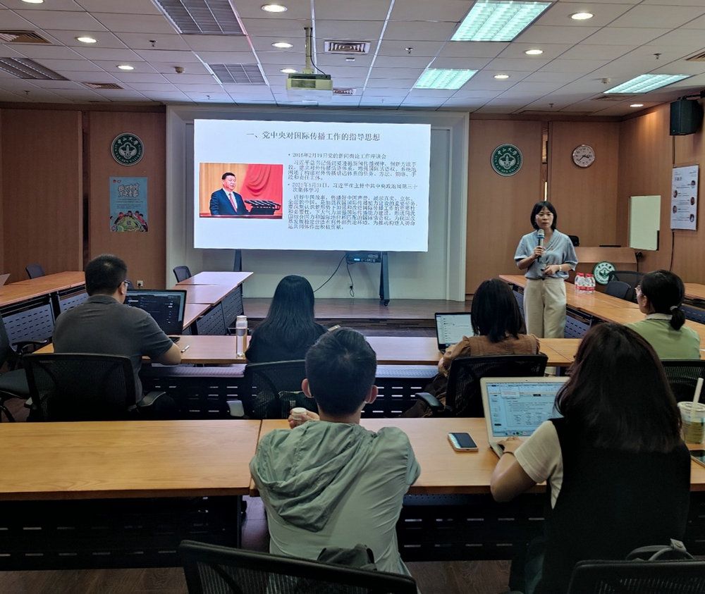 6月20日,學(xué)院黨委委員、院長鐘智錦教授結(jié)合黨中央對國際傳播工作的要求,為大數(shù)據(jù)傳播研究生黨支部講授了題為《創(chuàng)新國際傳播思維,有效傳播中國聲音》的黨課。她細(xì)致分析了當(dāng)前中國國際傳播面臨的困難與挑戰(zhàn),就“大數(shù)據(jù)和人工智能如何助力國際傳播能力提升”這一問題提出了監(jiān)測輿論動態(tài)、語言識別與翻譯等多個(gè)切實(shí)可行的建議,為支部同學(xué)未來的工作方向提供了指導(dǎo)。