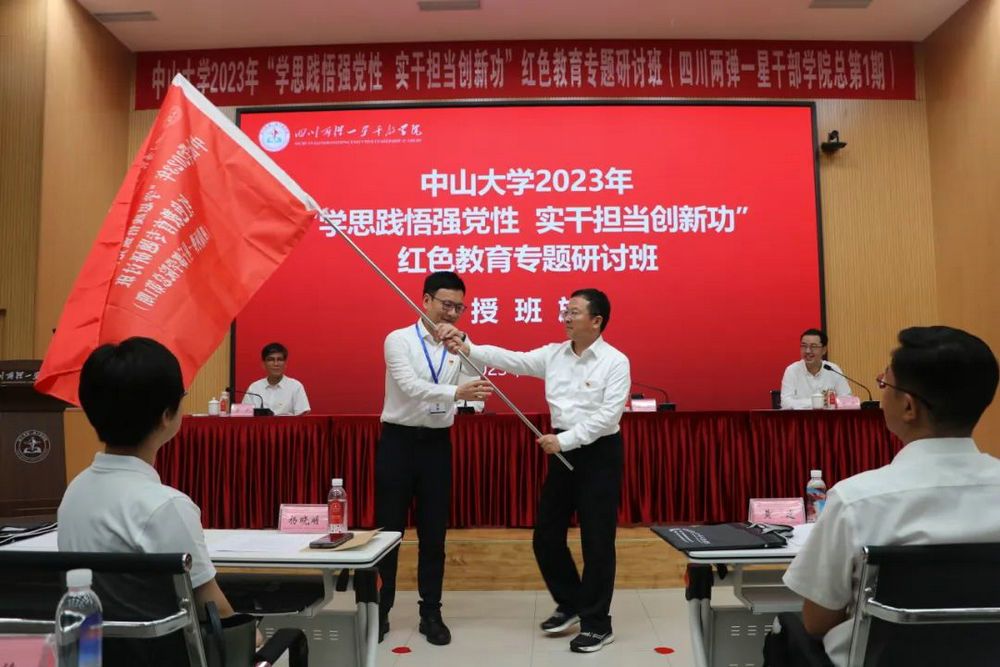 隨后,高松校長為此次培訓班授班旗,培訓班班長、中山大學附屬第一醫院副院長張弩代表班級接受班旗并鄭重表態,將以端正的學習態度、嚴明的紀律要求、積極的好學之心,帶著問題、帶著思考、帶著責任認真學,真正做到學有所思、學有所悟、學有所獲。