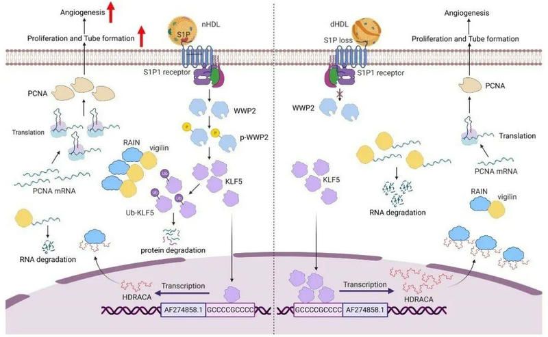 團隊首先通過對lncRNA測序結(jié)果分析篩選,發(fā)現(xiàn)HDRACA可調(diào)節(jié)血管內(nèi)皮細胞的增殖和管狀形成,并確定了HDRACA是定位于內(nèi)皮細胞漿中的長度553nt的無蛋白編碼能力的lncRNA。進一步實驗證實,nHDL可降低血管內(nèi)皮細胞中的HDRACA表達,而dHDL對HDRACA表達的降低作用明顯減弱。通過一系列分子實驗發(fā)現(xiàn),nHDL攜帶的S1P可與血管內(nèi)皮細胞的S1P1相互作用誘導(dǎo)WWP2泛素連接酶磷酸化激活,催化HDRACA的轉(zhuǎn)錄因子KLF5泛素化降解,抑制HDRACA的轉(zhuǎn)錄。而dHDL攜帶的S1P含量明顯減少,導(dǎo)致dHDL對HDRACA表達的抑制作用明顯減弱。進一步實驗證實nHDL抑制血管內(nèi)皮細胞的HDRACA表達可促進血管新生,而dHDL對HDRACA表達的抑制明顯減弱,導(dǎo)致它無法有效地促進血管新生。團隊還發(fā)現(xiàn)HDRACA可以結(jié)合重要的血管新生調(diào)節(jié)蛋白RAIN,抑制RAIN和Vigilin的相互作用,進一步促進Vigilin誘導(dǎo)PCNA的mRNA不穩(wěn)定降解,從而抑制PCNA的表達。nHDL通過抑制HDRACA表達影響RAIN-Vigilin-PCNA相互作用,促進PCNA的表達而促進血管新生。而dHDL無法有效地抑制HDRACA的表達,導(dǎo)致PCNA的表達減少,無法促進血管新生。