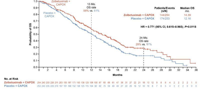 在關鍵次要終點方面,Zolbetuximab與CAPOX聯合用藥顯著延長了OS,治療組和安慰劑組的中位總生存期分別為14.39個月(95%CI:12.29-16.49)和12.16個月(95%CI:10.28-13.67),死亡風險降低了22.9%(HR=0.771;P=0.0118)。此外,在CAPOX基礎上加入Zolbetuximab進行治療,未增加嚴重不良反應發生率(治療組和安慰劑組分別為47.2%、49.8%)