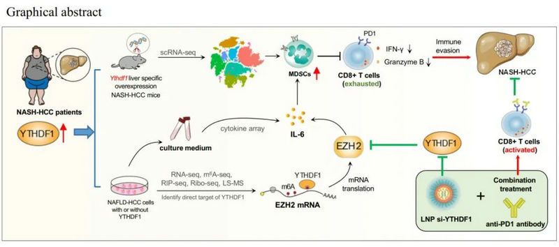 該研究首次發現YTHDF1-EZH2-IL-6信號軸可以招募和激活MDSCs,導致細胞毒性CD8+T細胞功能障礙,從而促進NASH-HCC的發生和發展。靶向YTHDF1可以提高NASH-HCC抗anti-PD1免疫治療應答新靶點。