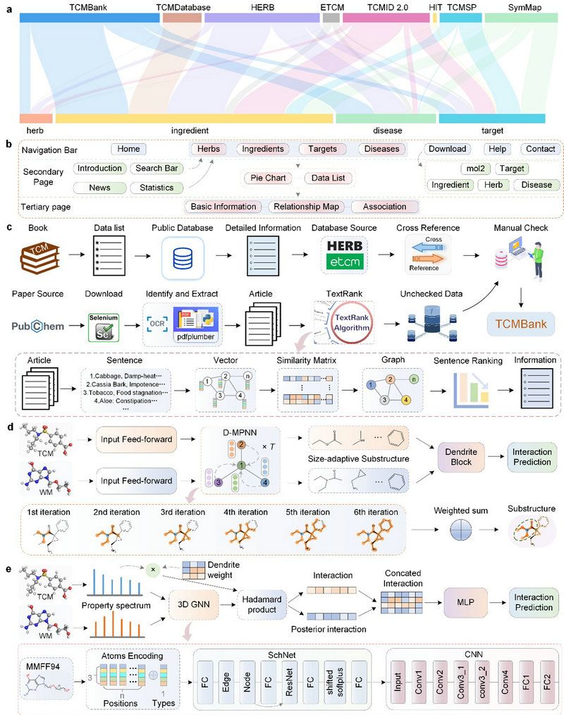 圖1. 中醫藥數據庫TCMBank的綜合分析。 A. TCMBank與其他中醫藥數據庫的數據量對比,其中TCMBank的草藥、成分、疾病最為豐富。B. TCMBank網站的結構,包括導航欄、首頁、二級頁面、三級頁面。C. TCMBank中數據處理的框架示意圖。D. 基于圖神經網絡的藥物官能團提取的自適應子結構感知模塊示意圖。E. 基于因果學習的中西藥互斥預測。(圖源自Signal Transduction and Targeted Therapy)