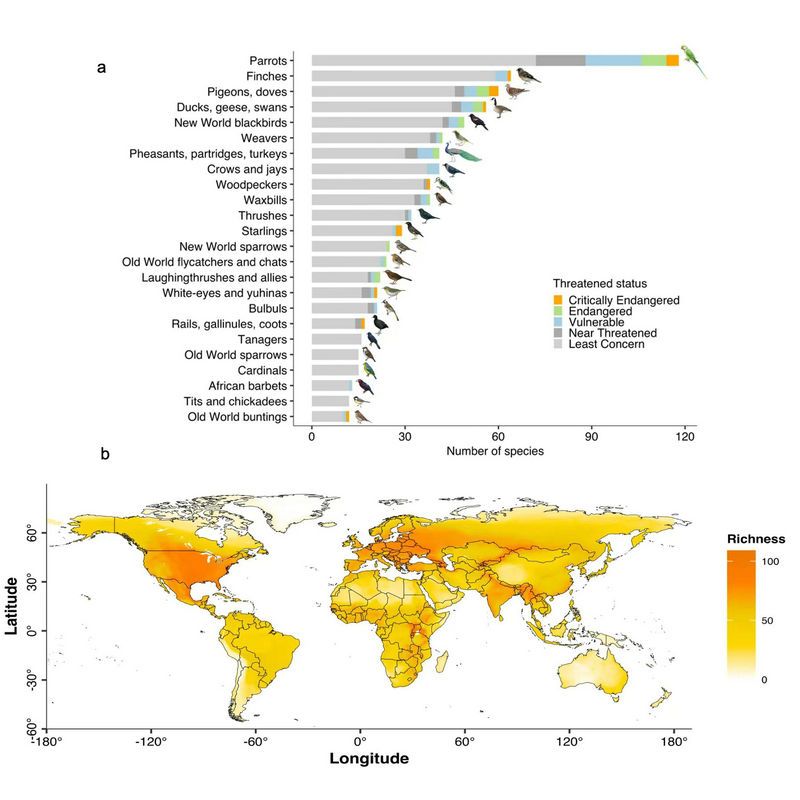 圖1 采食農作物鳥類的物種數量。(a)展示了采食農作物鳥類的主要科(前25%)以及對應的受危物種數量;(b)展示了采食農作物鳥類豐富度。