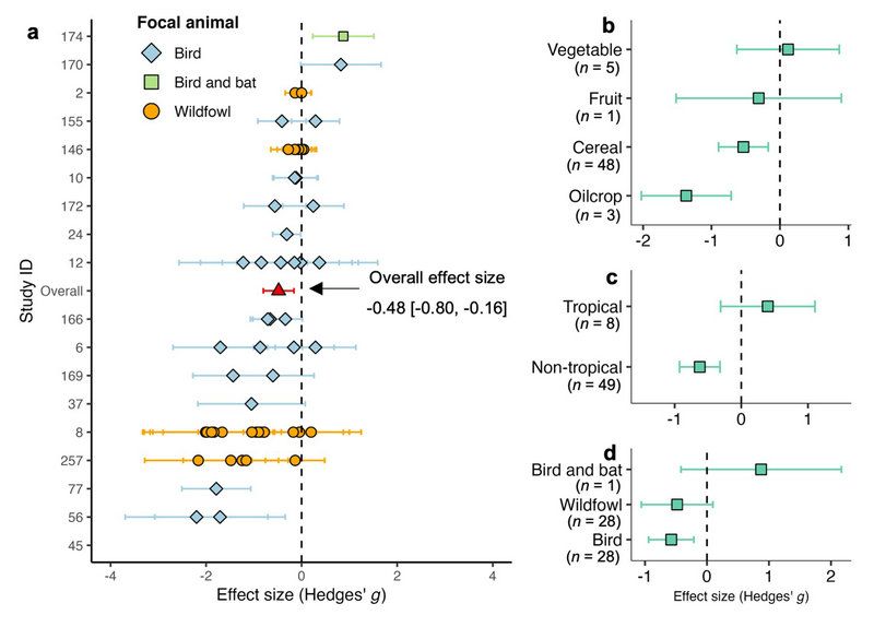 圖3 鳥類對草本作物產量的影響。(a)鳥類對農作物產量的影響;(b)不同食物類型間差異;(c)在不同氣候帶之間的差異;(d)不同目標類群之間的差異。
