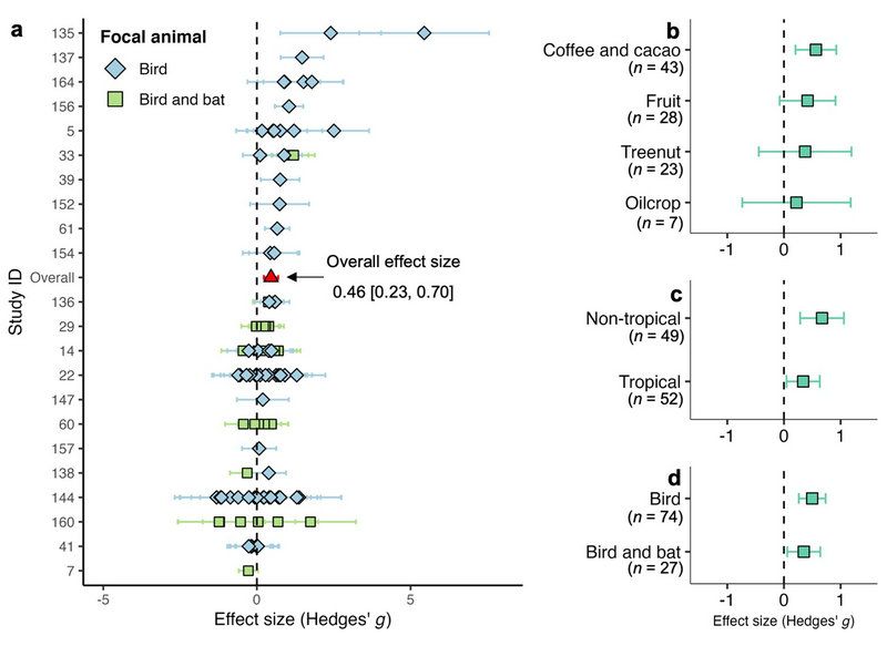 圖2 鳥類對木本作物產量的影響。(a)鳥類對農作物產量的影響;(b)不同食物類型間差異;(c)在不同氣候帶之間的差異;(d)不同目標類群之間的差異。