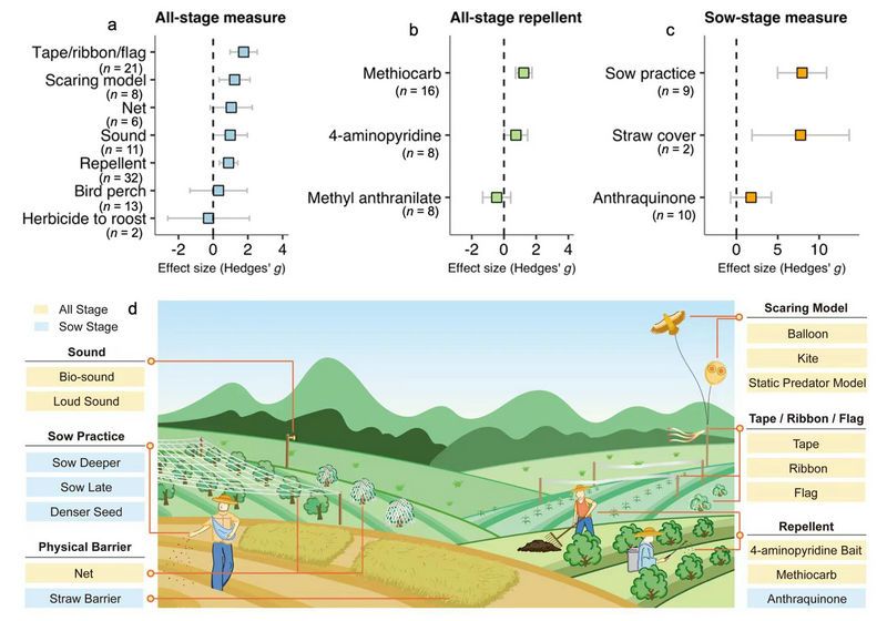 基于以上證據,可以看出,減少鳥類造成的農作物損失對人與農田鳥類的和諧共存至關重要,尤其是針對草本作物。為了評估緩解措施的成效,該研究構建了包含114個緩解措施實驗數據的數據集。
