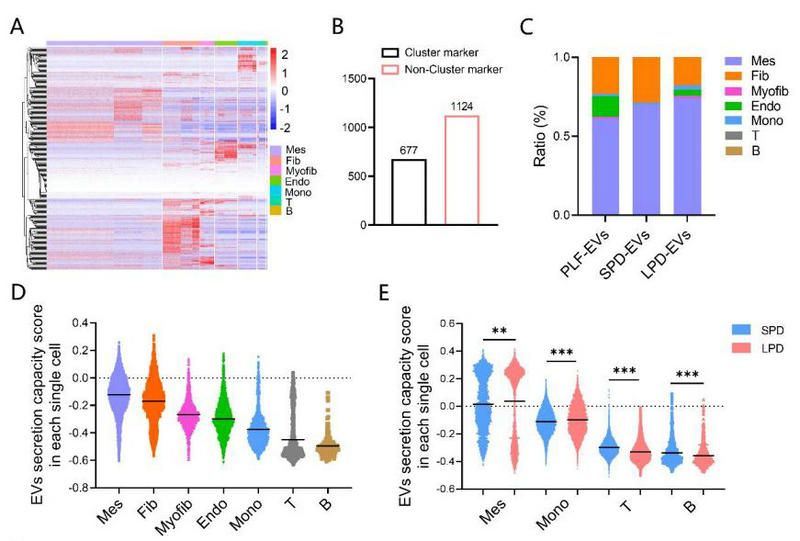 彭暉教授團隊首先通過超速離心法分離了腎功能正常患者手術時的腹腔灌洗液,短期、長期腹膜透析患者腹透流出液來源的EVs,并對這些EVs進行無標記的4D LC-MS/MS蛋白組學測序。隨后整合分析了EVs蛋白組數據和腹膜組織scRNA-seq數據,發現編碼這些EVs蛋白的基因表達水平具有細胞類型特異性,通過多主體單細胞去卷積算法分析顯示,間皮細胞是腹透流出液EVs的主要起源細胞。EVs起源細胞中,間皮細胞、成纖維細胞等實質細胞所占比例明顯高于 T 淋巴細胞、B 淋巴細胞等免疫細胞。團隊進一步在腹膜組織和腹透流出液脫落細胞的單細胞轉錄組數據中進行單樣本基因集富集分析。結果發現,單個實質細胞,特別是間皮細胞和成纖維細胞,比其他腹膜細胞釋放更多的EVs,并且長期腹膜透析刺激下的單個間皮細胞分泌更多的EVs(圖1)。