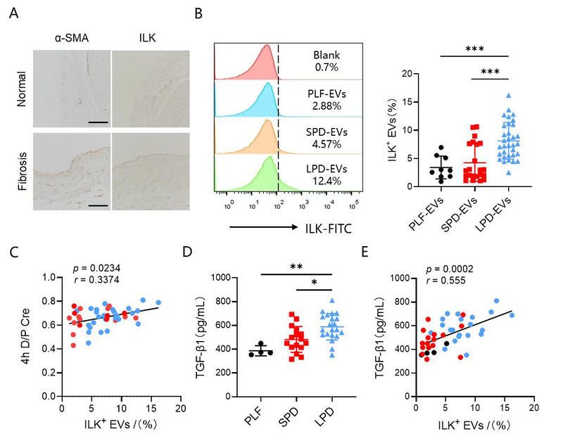 最后,研究者發現ILK在纖維化的腹膜組織中表達上調,ILK陽性EVs的比例在長期腹膜透析患者的腹透流出液中升高。ILK陽性EVs的比例與腹膜功能和TGF-β1的表達水平呈正相關。這些結果表明ILK陽性的EVs可能是預測腹膜透析患者腹膜功能失調和纖維化發生的潛在生物標志物(圖3)。