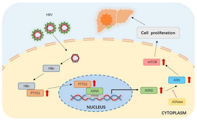 郭云蔚教授團隊通過研究發現,PTTG1的高表達是肝細胞癌包括乙肝相關性肝細胞癌發生發展中重要的促進因素之一。HBx通過與PTTG1結合促進PTTG1的表達以及入核,并通過PTTG1發揮致癌作用。PTTG1通過與ASNS啟動子區域結合上調ASNS的表達,并進一步上調天冬酰胺代謝,激活mTOR通路,從而促進肝癌細胞增殖及肝癌的進展。