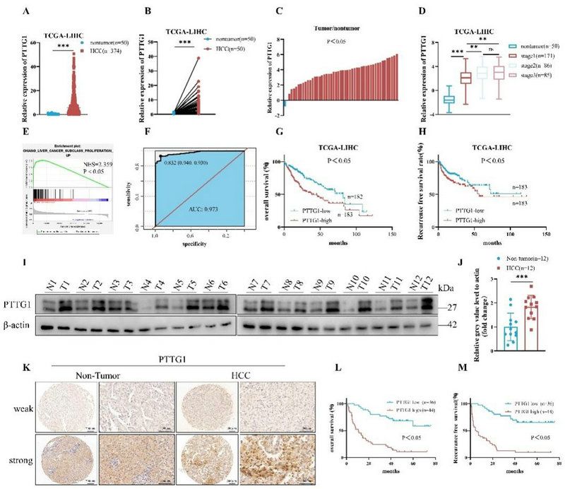 肝癌組織重新調整其代謝過程,滿足并維持肝癌細胞增殖的能量和代謝需求。ASNS催化天冬氨酸轉化為天冬酰胺,滿足腫瘤細胞對天冬酰胺的需求。PTTG1是一種垂體衍生的轉化基因,被認為對維持正常細胞周期調控有著重要作用,在腫瘤中的研究證實是一種參與增殖和代謝的原癌基因。團隊前期研究通過轉錄組學篩選出PTTG1是肝癌組織中上調最明顯的基因之一,但具體的作用及機制尚不明確。因此,探究PTTG1在肝癌發生發展過程中的具體作用及調控機制,對探索肝癌治療的新靶點至關重要。